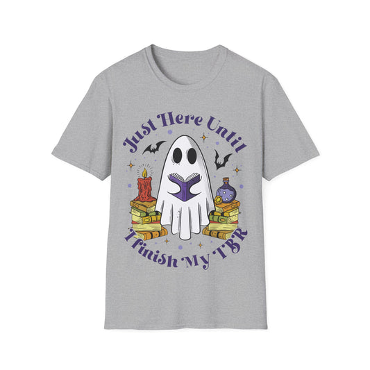 "Just here until I finish my TBR" ghost Halloween shirt, ghost reading, booktok, book lover, Halloween lover, summerweek, books, funny book shirt, Halloween book tee.