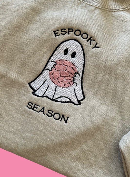 Espooky Season embroidered ghost crewneck, Mexican concha, pan dulce Halloween, Spooky, cute Halloween sweatshirt, latina, Latino, boo, fall